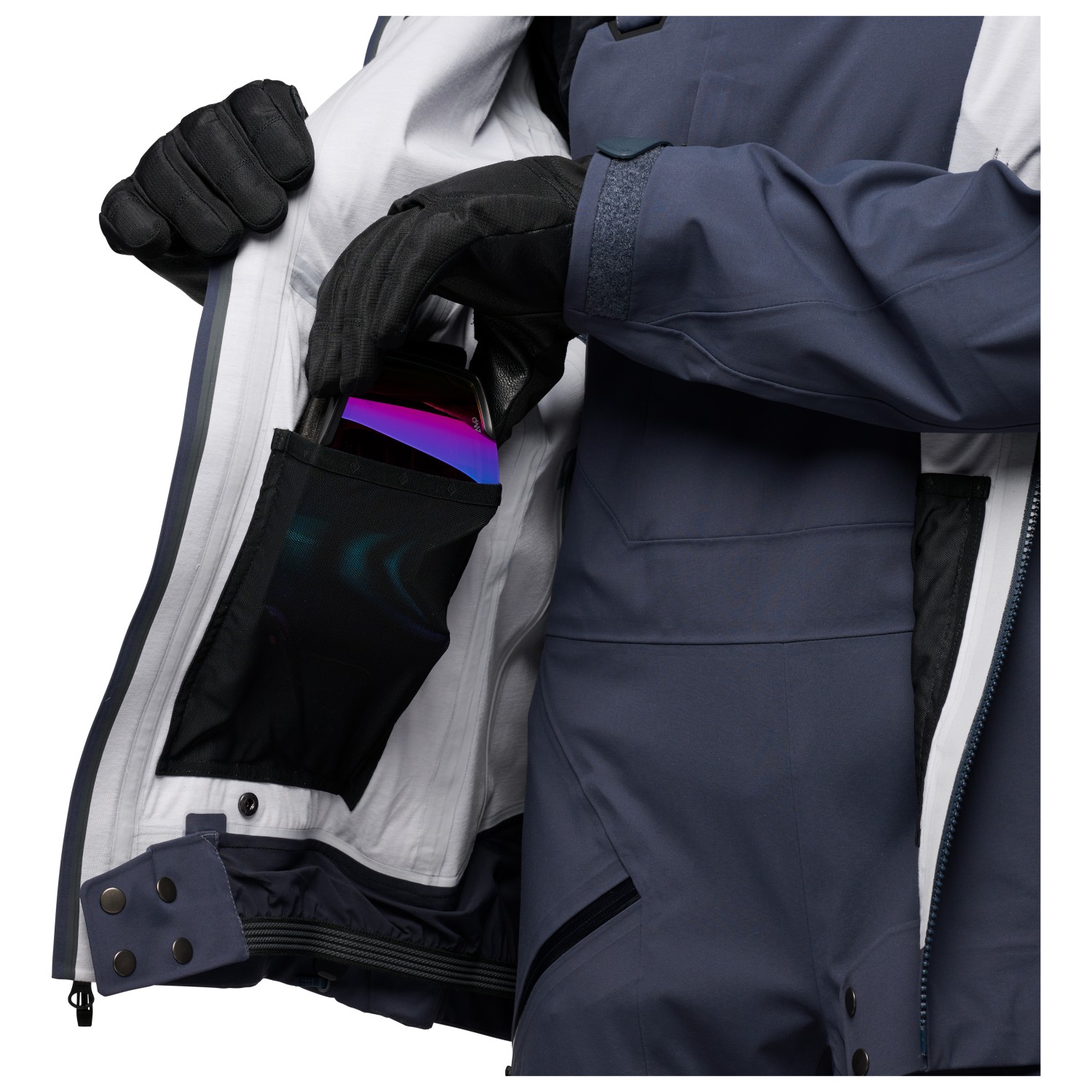 - 2 poches poitrine, 2 poches intérieures, 2 poches avant zippées, poche forfait