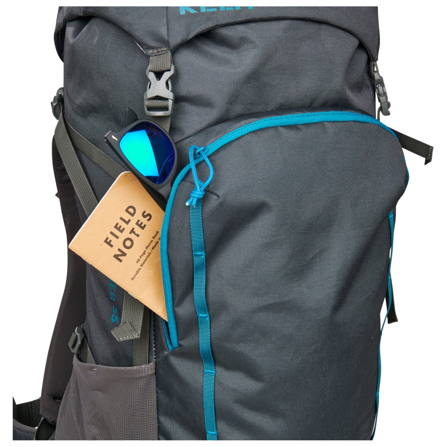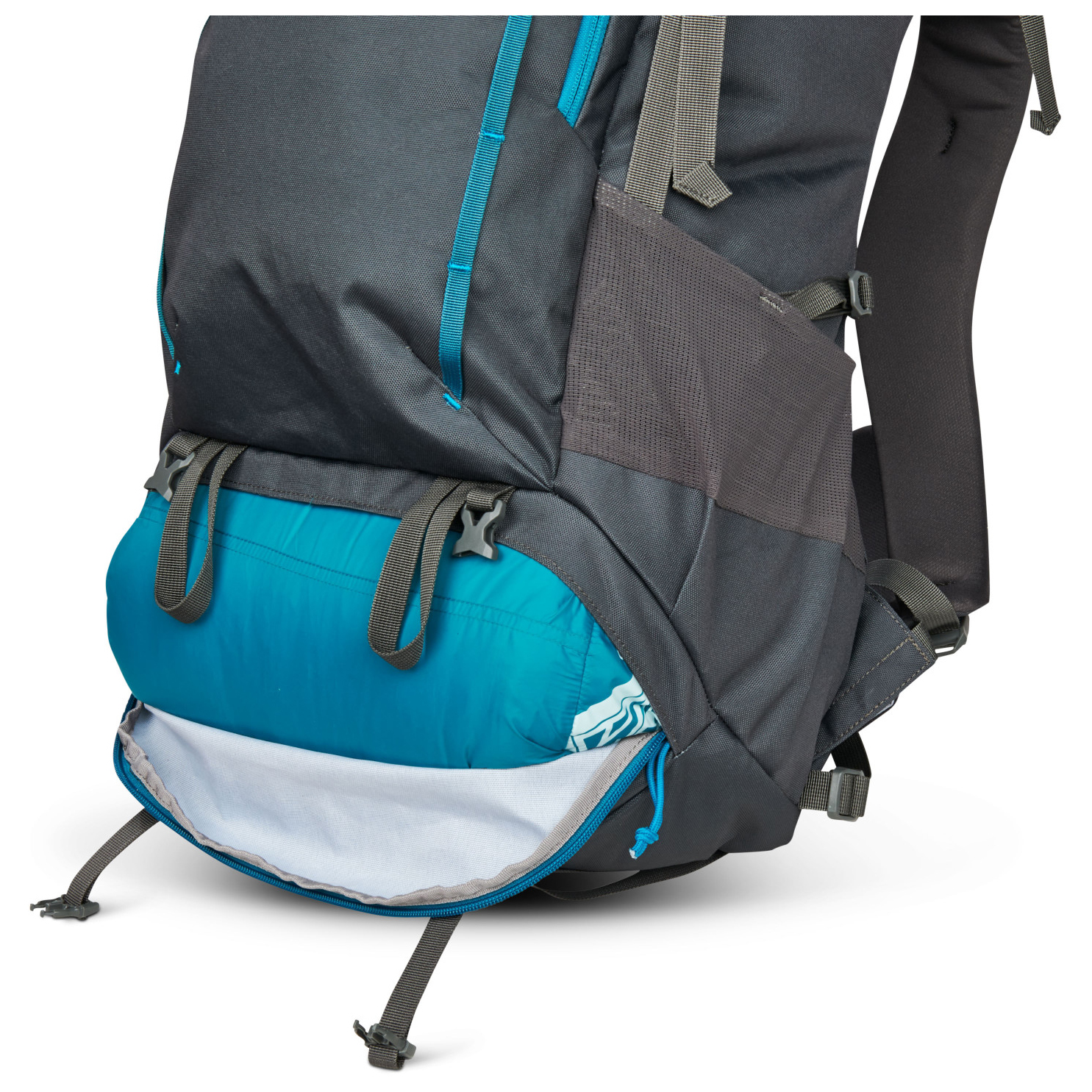 - 2 compartiments latéraux en mesh, attache pour bâtons de marche, compartiment avant, poche sur la ceinture de hanches, compartiment pour sac de couchage